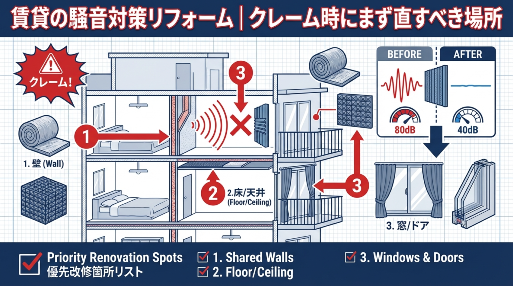 この記事では、賃貸の騒音クレームに対して、何を優先して直すべきかを整理しました。