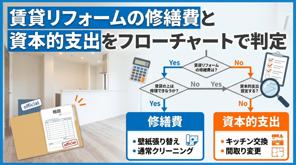 本記事では、賃貸リフォームの修繕費と資本的支出の違いを、国税庁の基準をもとにフローチャート形式で整理しながら、20万円・60万円・10%・3年周期の考え方や、工事前に確認したい実務ポイントまでわかりやすく解説します。(専門知識は不要です!)